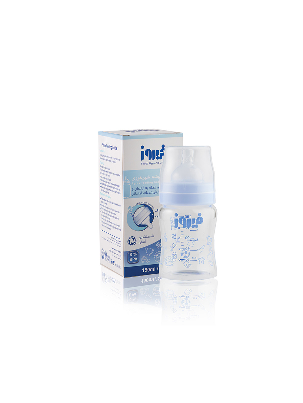 شیشه شیر پیرکس دهانه عریض آنتی کولیک فیروز 150 میلی لیتر می باشد. نوزاد نیاز به خوردن شیر کمکی در کنار شیر مادر دارد و یا مادرانی که وقت کافی برای شیر دهی به کودک ندارند شیشه شیر پیرکس آنتی کولیک فیروز وسیله‌ ای مناسب بوده که می‌توان آن را از همان ابتدای تولد نوزاد استفاده کرد. این محصول کیفیتی مرغوب داشته و فاقد BPA است. جنس بدنه شیشه ای (پیرکس) و سر شیشه آن سیلیکونی می باشد که در هنگام خرید باید بدان توجه کرد. این شیشه شیر ضد نفخ یا همان آنتی کولیک بوده که این ویژگی به نوزادانی که دچار دل درد (کولیک) می‌شوند، کمک شایانی می کند. یک درپوش پلاستیکی شفاف بر روی در آن قرارگرفته است تا علاوه بر حفظ سر شیشه از آلودگی مانع ریختن شیر هم می شود. شیشه شیر پیرکس دهانه عریض آنتی کولیک فیروز دارای سر شیشه با سری گرد است که باعث می شود کودک به راحتی آن را قبول کند.